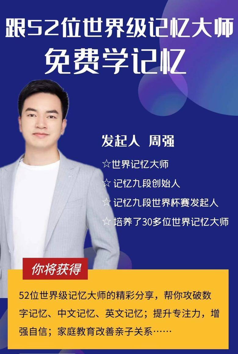 今天孩子学习记忆九段的周强老师又带给我们一个大福利,让更多的人了解学习记忆方法,提高学习效率,让我们建群可以跟52位记忆大师免费学记忆,相信愿意学习的同学还是多吧。好幸运好感恩遇到这样的明师!