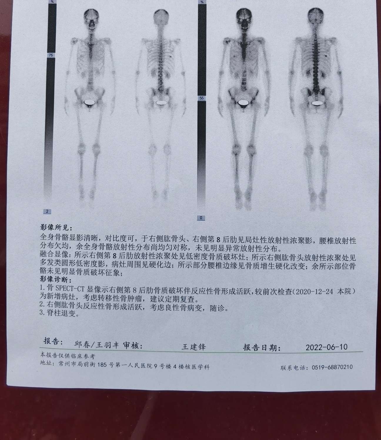 破损有可能是做骨扫描吧