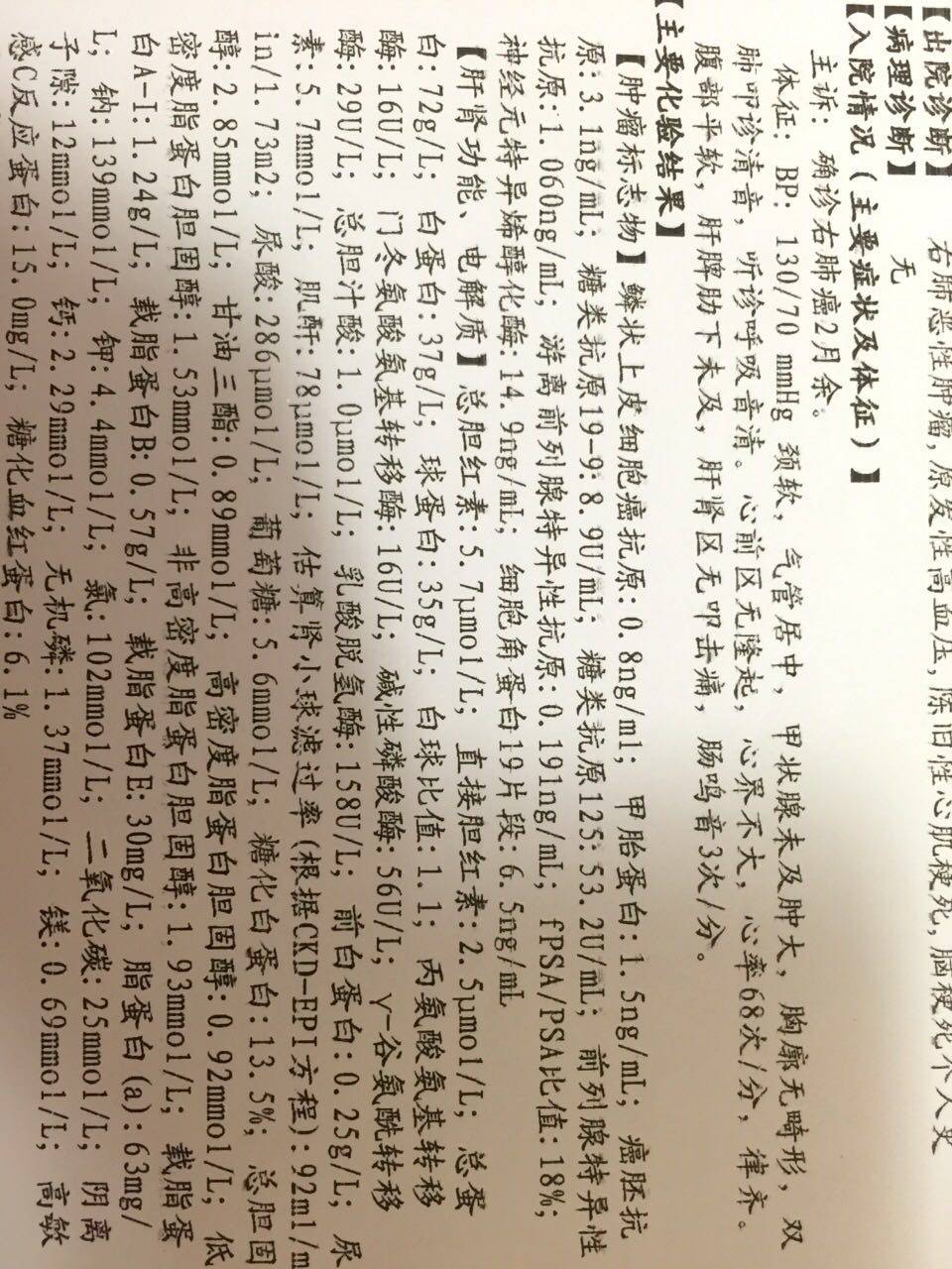 ,现在第三次化疗第十天了,爸爸血常规也恢复得不错,化疗后爸爸也没有任何不适,现在也没咳血了。总之心态战胜一切,努力把心态调整好,一切都会好起来的。两张癌胚抗原,一张是爸爸当初发现时的检查,一张是这次去化疗前的检查可对比一下,当初我爸是CA-125上升到101.2查出得了肺癌,现在我爸的CA-125已经降到53.2,CA-19一院是9.36。现在是8.9,癌胚抗原一院是3.17,现在是3.1。都在改善,希望好运常伴,爸爸的病情控制,多活几年。最后还是要祝愿大家身体安康,平安喜乐。