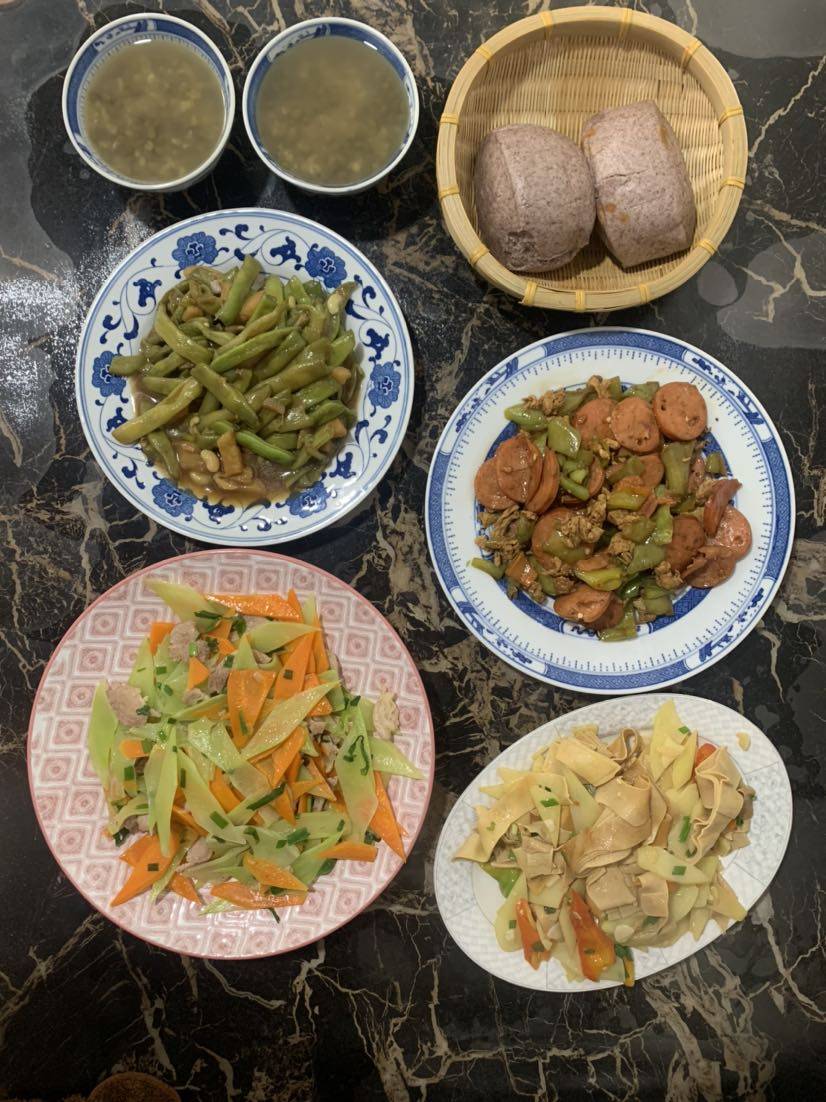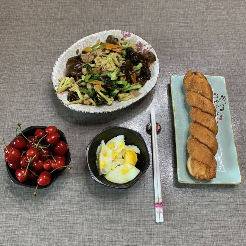 今天小岛下雨☔️老王自己先去单位,我一个人在家吃早餐,蒸笨蛋,木耳炒青菜🥬胡萝卜🥕菜花🥦麻花是买的