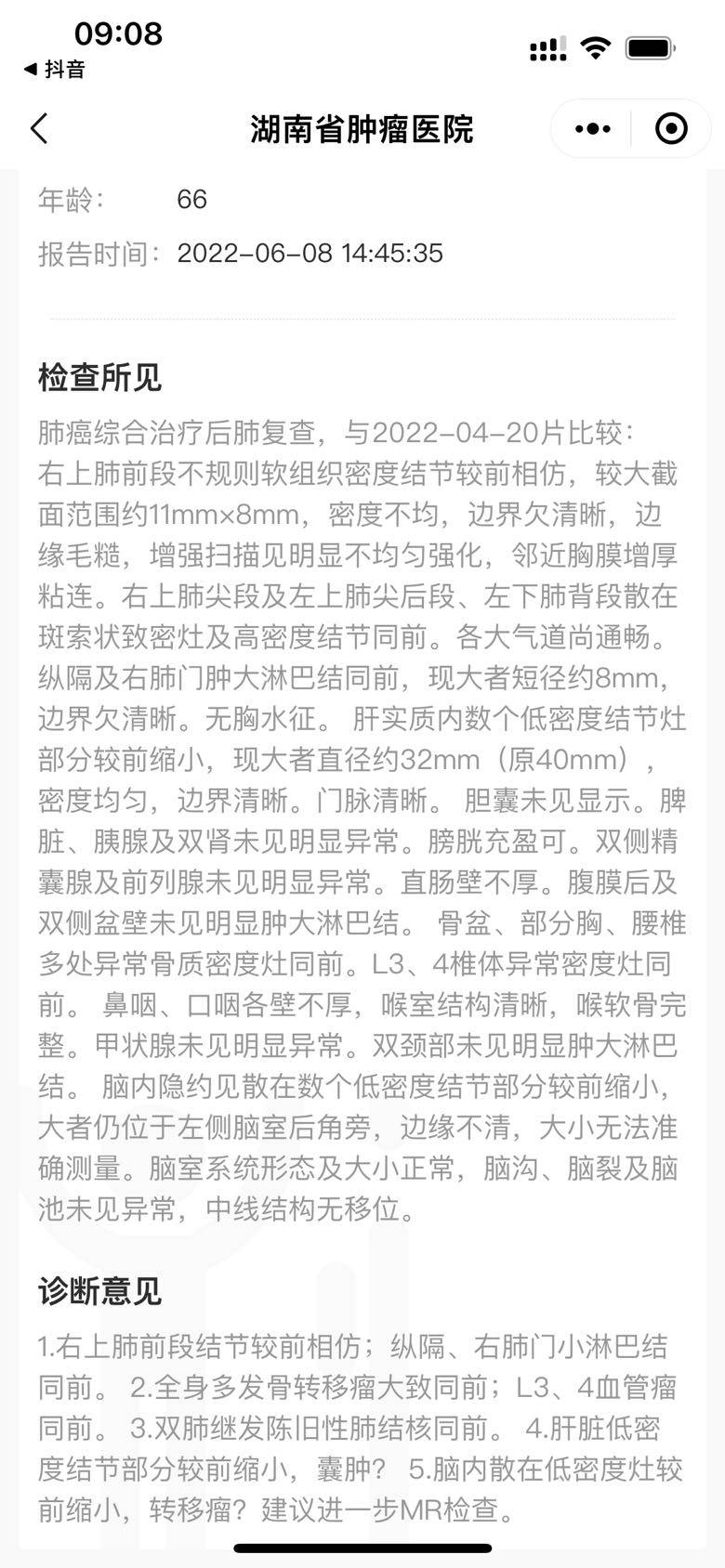 达可替尼3个多月了 这次复查原发炤没有缩小 淋巴结跟上月也一致,其实复查应该是两个月这次时间还没到,不过这个月老刘觉得视力有些下降 害怕是脑部结节增大压迫神经了 毕竟原来是没有症状的,庆幸核磁出结果 脑袋结节这个月又缩小了,2月脑部结节15mm吃完第一个月到了10mm,随后一个月没有变化有点小失望,尤其是这个月原发炤都没有继续缩小了 我都害怕是不是维持现状开始稳定期要耐药了 毕竟L858突变没有19效果好,没想到复查的脑袋结节继续缩小又给了点惊喜。在这里还是很感谢省肿瘤的张乐檬医生,副主任医生 如果看资历挂号可能不会选他,我们家当时住院很幸运分到张老师手上 ,整个过程张医生我认为你问他 他是有回应的 微信也会回复,当时基因检测结果出来选择靶向药的时候也会告诉我现在基本选择,我告诉医生就希望吃的时间长一点延长病人生命时间,那他就帮我选了达可 后面看数据和通过网上资料学习 达克替尼还是很适合L858突变的,而且当时张老师也说达可实际也是对入脑有效果 省肿瘤有实验数据,这样就更坚定我信心,马上在外面拿药当天就吃下了。回想这几个月时间从年初确诊到现在,家里老刘也似乎把所有坏运气用在了确诊时候,后续每一步都很幸运 有靶向药 有好医生 有好的效果 对了 还要感谢省肿瘤放疗科肖琴医生 人真的超温柔 当时2月份才确诊 骨转 左髋关节疼得走不了路 主治张医生联合放疗科做10次放疗 如果正常程序是要到6月份才能排上 肖医生给我们走的急诊绿色通道,这里所有的所有我们没有找关系也没有熟人,都是正常流程,很庆幸来的省肿瘤 医生专业 设备精准 谢谢大家 还有觅建朋友告诉我的很多建议 万分感恩 希望他能吃药久一点再久一点。