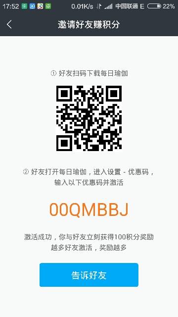 亲爱的们,每天抽点时间练瑜伽吧!瑜伽会随着时间让你变得健康美丽!每日瑜伽,你值得拥有!亲们下载完后记得在设置里面激活我的邀请码喔,这样我们都有积分喔,等积分够了就可以看会员的专属瑜伽视频了,你们也可以分享你们的邀请码给我还有其他朋友,这样我们的积分就越来越好啦,1000积分就可以换一个月的会员了喔!来吧!
