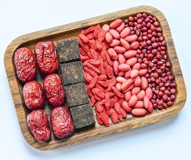 枸杞20粒、红枣5粒、红豆20粒、红皮花生米20粒、红糖适量。