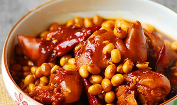 猪手、黄豆、油、盐、黄豆酱、干辣椒、花椒、葱、姜、八角、料酒、酱油。
