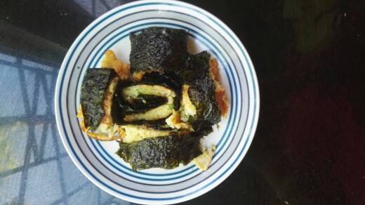 海苔卷蛋饼,第一次做看着凑活,不过味道相当不错,看我家儿子的吃相就知道