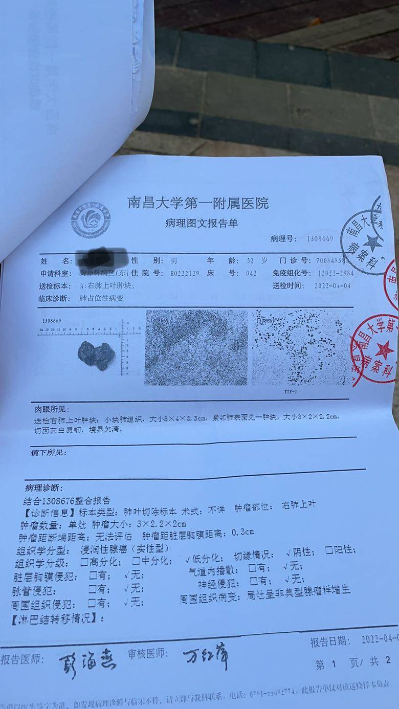 2022年3月是单位每年例行体检,我年年体检没啥毛病,想着让老公去检查吧!3月30下午老公去做了肺部CT,因为他爸56岁就因为肺癌过世,我害怕遗传,也一直劝他戒烟,可他始终不听。刚做完CT半小时,医院就打电话说有问题,赶紧增强CT复查,因为太晚,第二天上午找他同学(他同学是呼吸科主任)安排做,一做完我们是在CT室直接看片子,我听着两个主任说是恶性的,还有多个淋巴结转移,我脑子都懵了。我们刚刚生了二胎,女儿才四岁,不能这么小就没了父爱。眼泪止不住哗哗流,心里却告诉自己要坚强,不能垮了。我哄着老公说只是个结节,要他先回家,我还要去单位有事。回了单位,饭也没吃,坐办公室一直哭,边😭边打电话联系医院。当时疫情形势严峻,只能就近治疗,选择了南昌大学一附医院。很幸运找到了胸外科刘升主任,把CT片发给他看,第二天就制定了手术方案,第三天碰巧清明假期,刘升主任没有休假,直接做了手术,手术很成功。术后四天就出院了,恢复很好。我非常感谢刘升主任,能遇上这样好的医生。