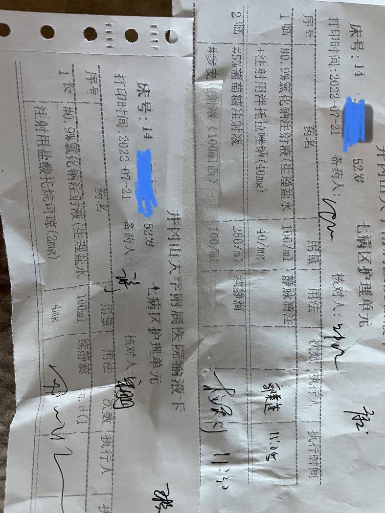 因疫情,第四化就在本地医院做了。确实在当地住院,无论什么都方便不少。呼吸科主任又是同学,对我们特别照顾。但用药有点不同,化疗前地塞迷松一直是服用400mg,这次换了医院加到了600mg。原来化疗完,都在家恶心呕吐几天才来住院,这次打完化疗,直接上止吐,营养液,在医院休养好了再回家。很庆幸,做了四次化疗一切正常,就是食补,什么都吃,也没忌口。每次做完化疗要瘦十几斤,很快就补回来了。我个人觉得,还是要吃,吃了才有抵抗力。熬完这次,以后就单免了,希望副作用小点,老公少受点罪!附上化疗后的输液单,老公打上三五天就恢复正常了,供大家参考。