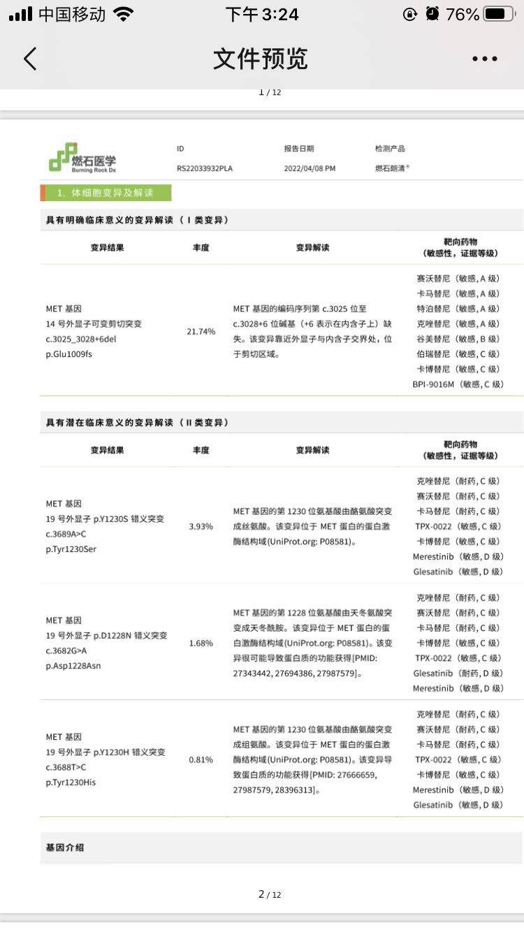 一、2021.3卡马替尼耐药,血液基因检测met14,met19 1228n,1230h,1230s