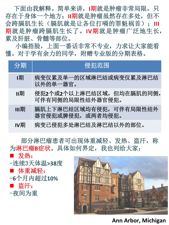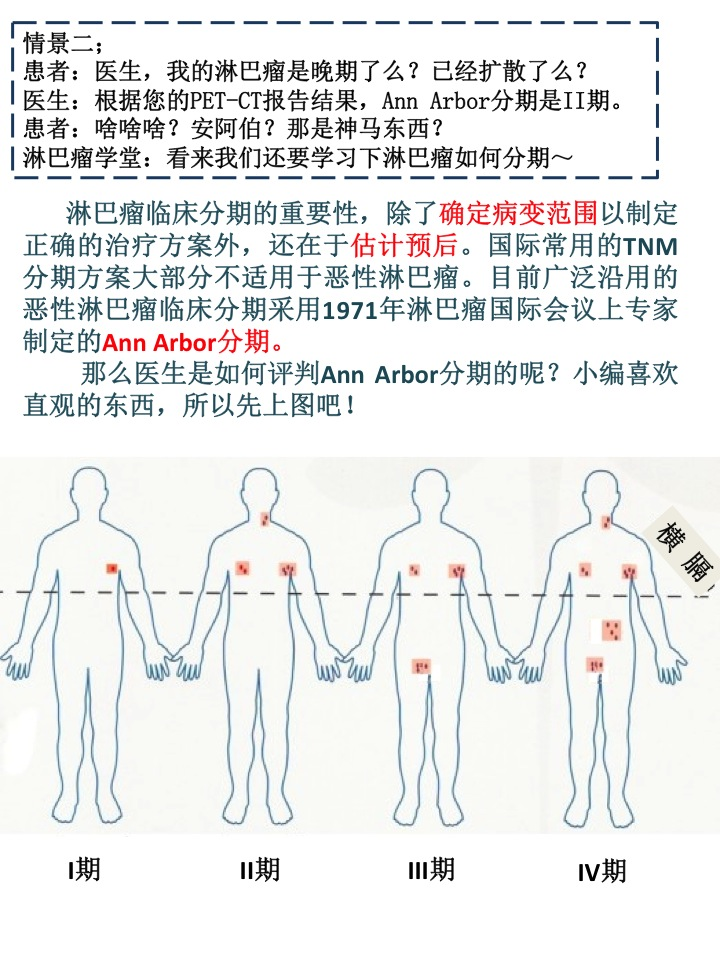 | 淋巴瘤分期目前采用分期 Ann Arbor 系统一。Ann Arbor 分期系统 I侵犯单个淋巴结区域(I)或单个结外部位(IE) II 侵犯 2 个或 2 个以上淋巴结区域,但均在隔肌的同侧(II),可伴有同侧的局 限性结外器官侵犯(IIE) III 隔肌上下淋巴结区域均有侵犯(III),可伴有局限性结外器官侵犯(IIIE)或 脾侵犯(IIIS)或两者均侵犯(IIIES) 。 IV 在淋巴结、脾脏和咽淋巴环之外,一个或多个结外器官或组织受广泛侵犯,伴有或不伴有淋巴结肿大等。 国际预后指数(IPI),指标 0分、1分 。年龄 ≤60 岁 >60 岁 行为状态 0或1 2,3,4 ;Ann Arbor 分期 I 或 II III 或 IV LDH 正常、高于正常、结外病变受侵部位数 <2 个部位 ≥2 个部位 ,每一预后不良因素计数为一分。 上述 5 项指标评分的总和即为国际预后指数(IPI), 根据 IPI 进行危险度型,0-1 分为低危,2 分为中低危,3 分为中高危 4-5 分为高危。 对有 0~1,2,3,4~5 个国际预后指数的侵袭性非何杰金淋巴瘤病人, 其 5 年平均生存率为73%,51%,43%和 26%。 |