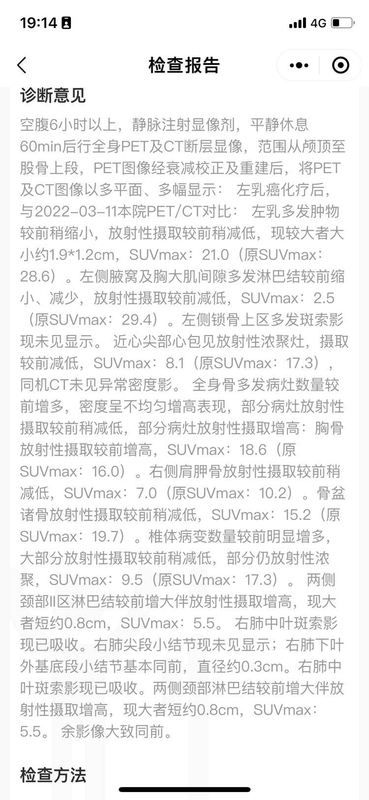化疗了六个疗程,现在已经住院一周,完成了各种检查,等报告中。左胸的肿块是较前缩小了,今天下午PETCT. 报告出来,各项指标都有好转,就是骨转移这边控制不大理想,我又有点焦虑了。其实自己这几个疗程下来,心态是越来越平静放松的。骨转移这个我根本就没什么症状,没想到就发展得这么严重呢。报告出来,今天主任也下班了,值班医生是年轻人,看不懂我的报告的。