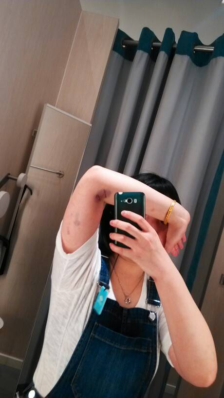我的淤青比你严重多了,是青色的,不是你这样发红的