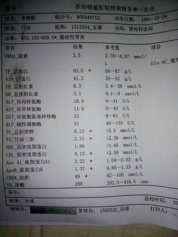 肌酐低没多大问题,高胆固醇就是少吃动物内脏。尿蛋白还是高,没控制好吧,问问医生怎样调药