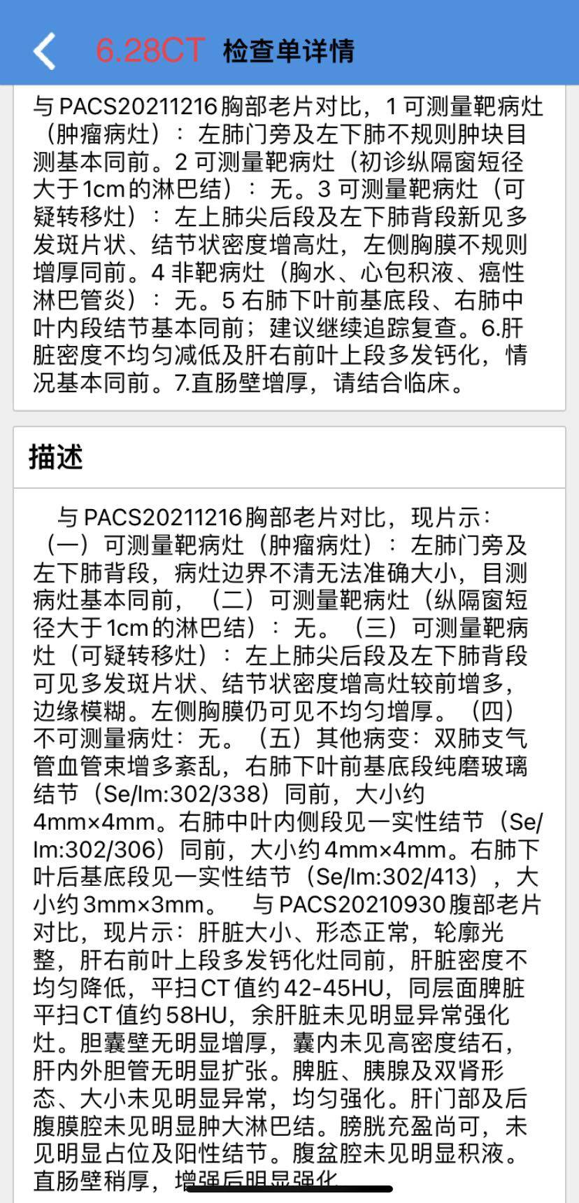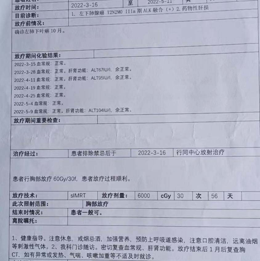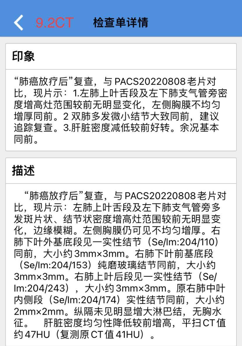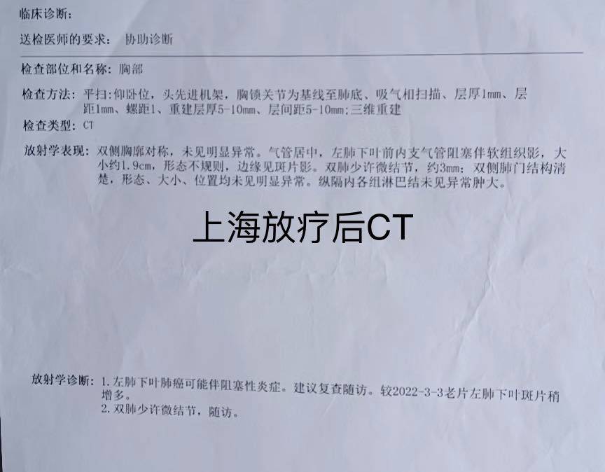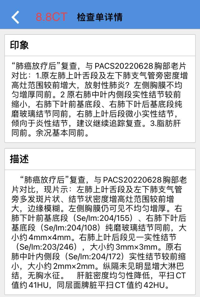 6月20号左右老公喉咙发热,痰里有点血丝,吓得我赶紧挂号复查了。通过CT和肺功能检查,医生判定大概率放射性肺炎,但不排除感染可能,让服用药物(醋酸泼尼松、还有护胃补钙药)后一个月复查。8月8号CT复查结果确实就是放射性肺炎的一个发展过程,减量服药。8月底老公感冒了,咳嗽有点厉害,给全家吓得不轻,又去挂号。幸好CT结果是好的,没有受到感冒影响,继续减量服用激素到停药。