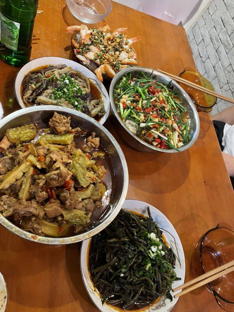 今天又正好是我深圳回家参加婚礼就被封在家里的同学的生日。每次她回来一定会请她吃饭的,今晚请朋友们到我家里庆祝。昨天收到的鱼,今天买了鸭,还有冰箱里存的东方甄选买回的虾,凑成一桌丰盛的晚餐。朋友们把酒言欢,俗人的幸福感就是吃吃喝喝。