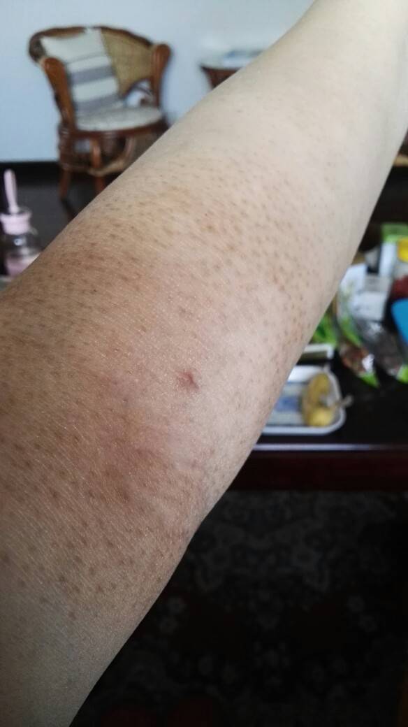 给你看看我的胳膊拔管一个半月了,愈合处留了个小疙瘩,透明贴过敏的黑色素还没退掉呢。