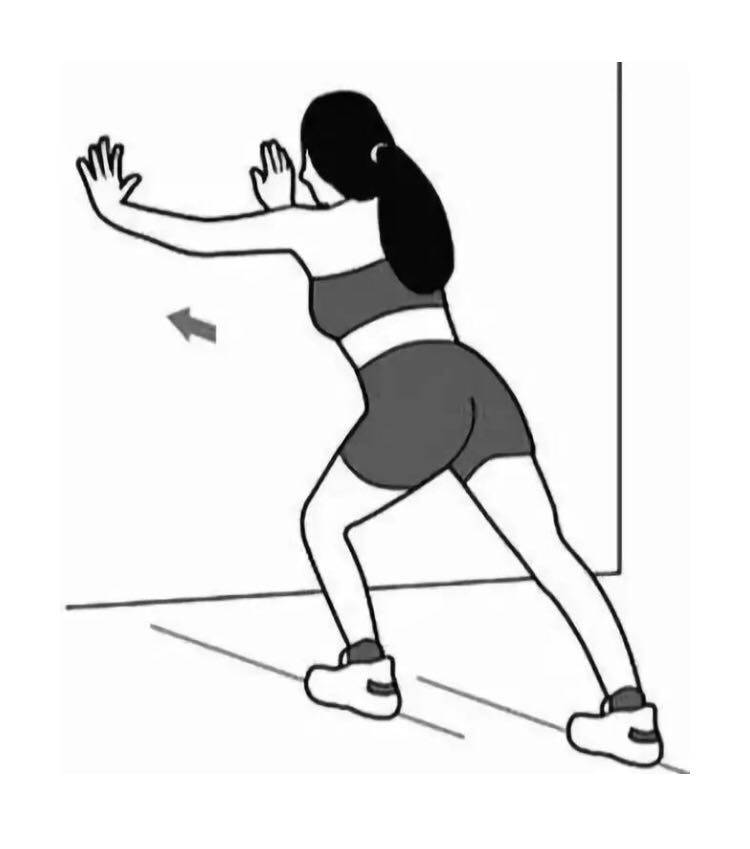 2,推墙5次:双手推墙5次,同时腹部和臀部用力,后腿的膝盖、脚腕后侧伸展绷直。推墙时后脚跟不要动。