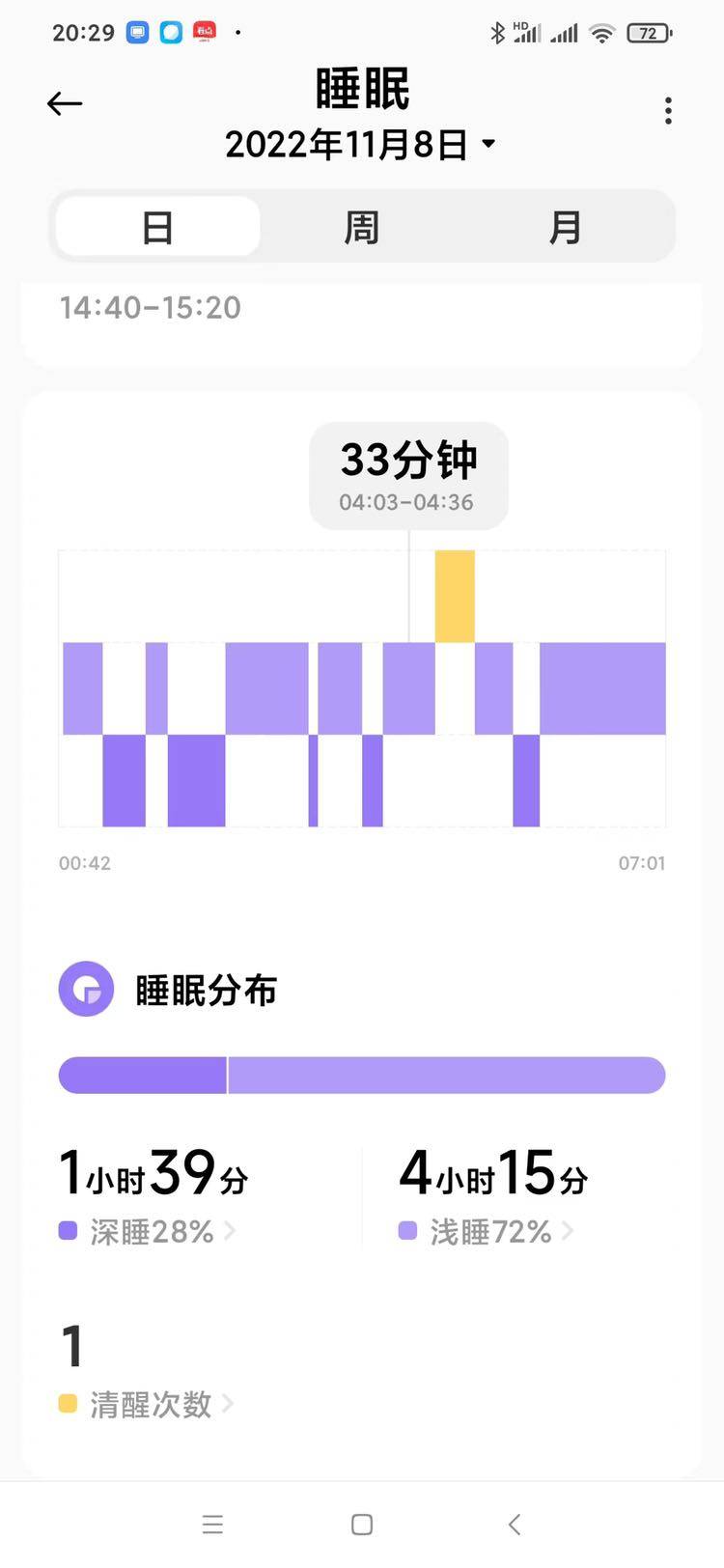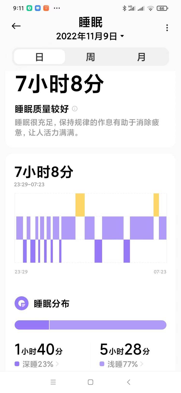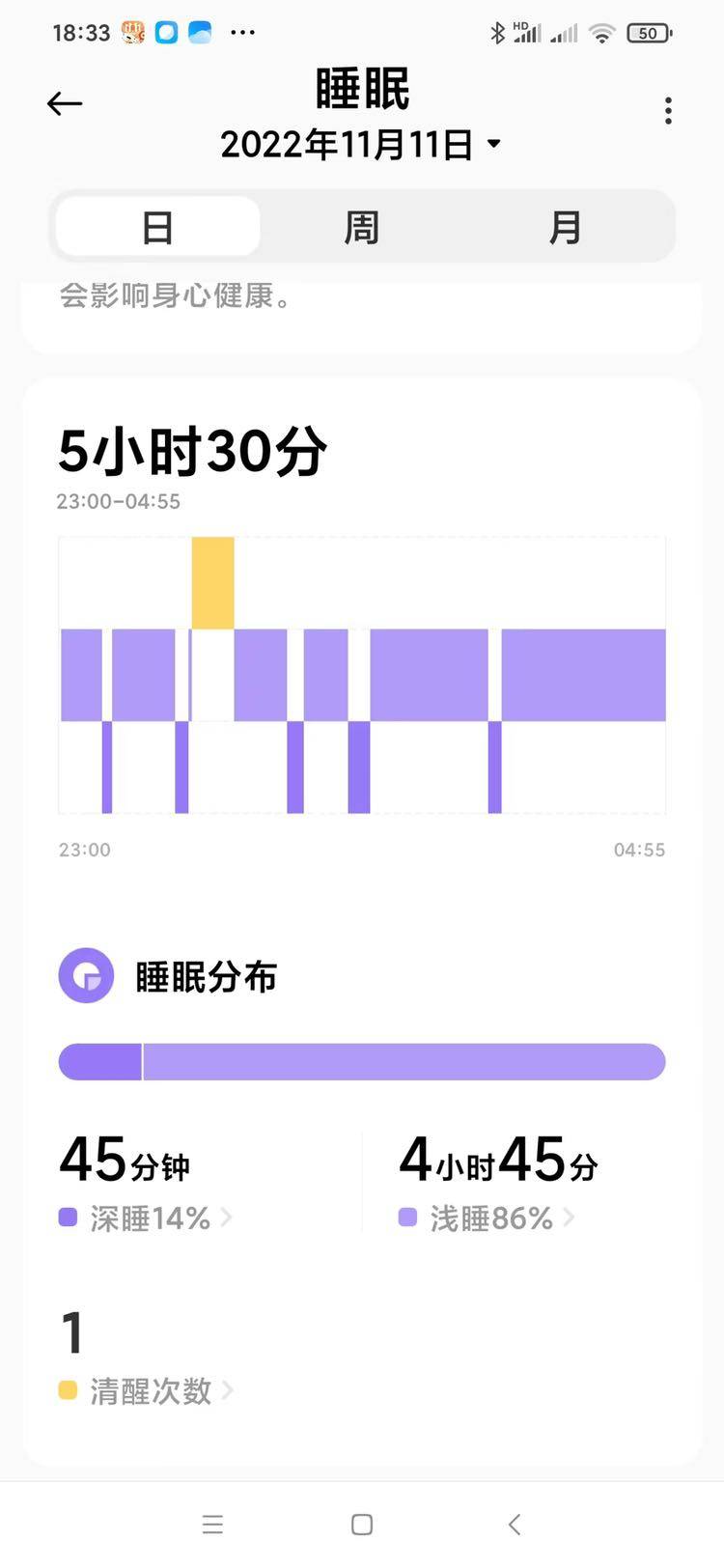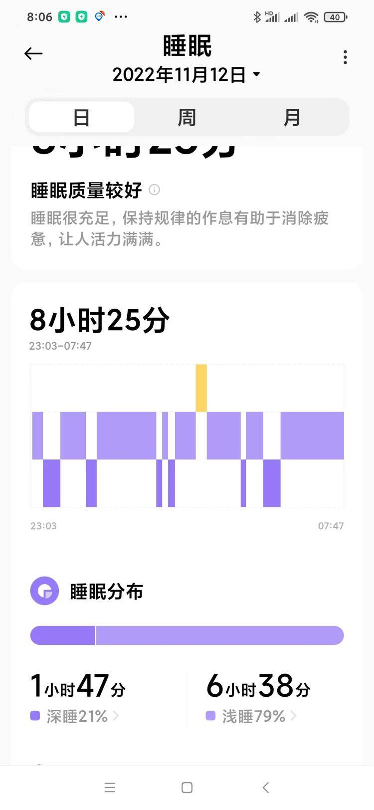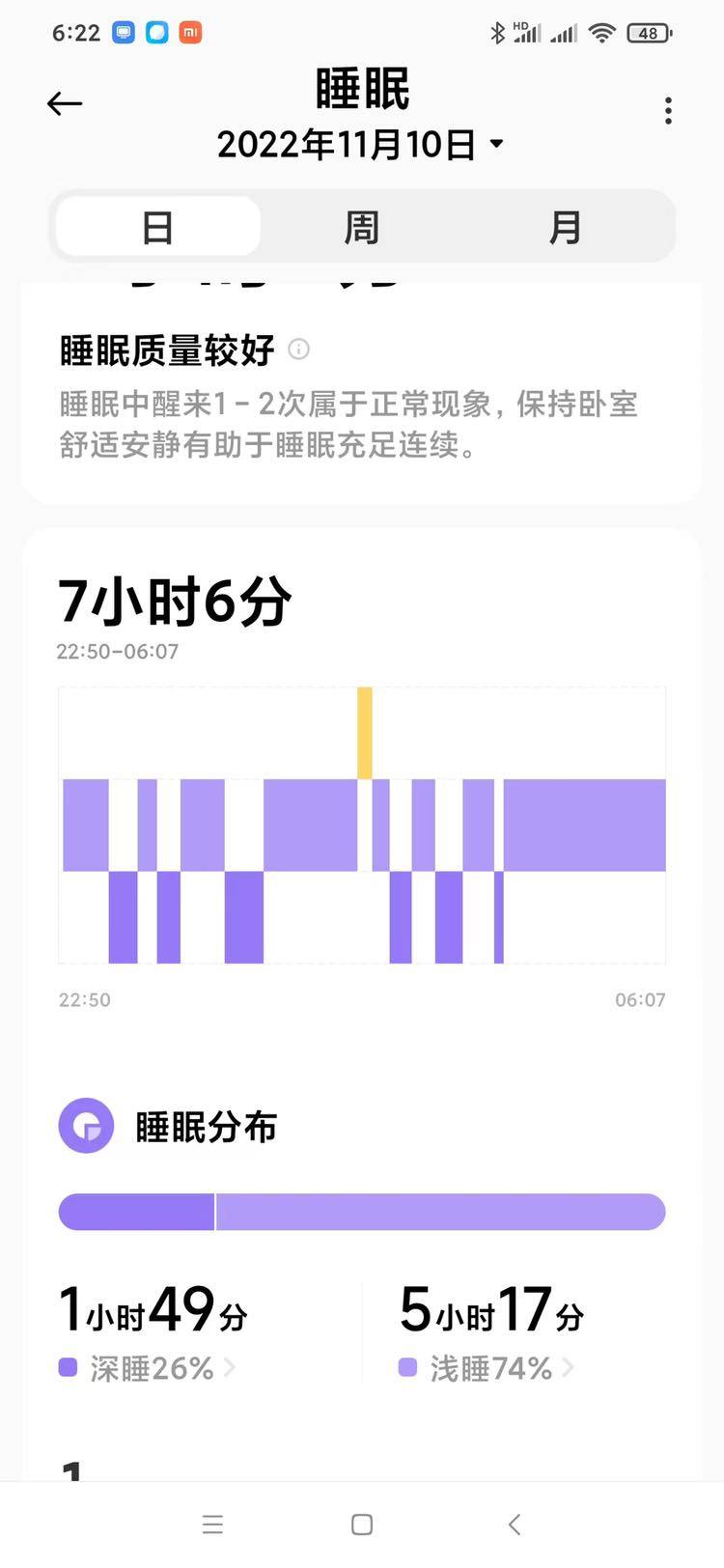以下是她过去5天小米手环记录的睡眠情况,除10号晚上洗澡提前入睡,醒来后无法入眠以外,其他几天的睡眠时长努努力都能赶上我的睡眠了。而术前在老家3个月,平均每晚睡眠不足6小时,深睡仅40-50分钟,夜里还醒来好几次,而且醒了就睡不着了。