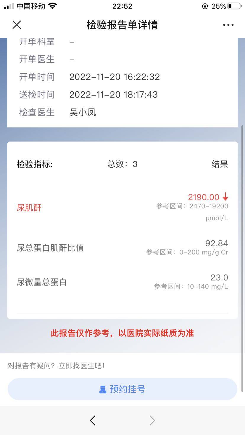 加班到3点半,没达6.5小时,不能算加班一天,我只上到了5.5小时,估计只能算半天。4点匆匆忙忙的赶到医院办理入院检查,这次办理出入院很是顺利,抽完血后,便办理出院且又带了两周的药,回到家8点多,这会终于能慢下来了。总得来讲,这是一个非常忙碌且做了很多无用功的一天,但却又是有丢丢幸运的一天,因为指标有在好转哦,但是尿肌肝比标准低了三百多耶。
