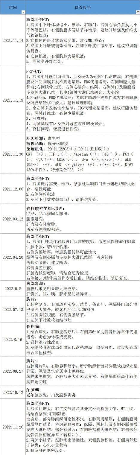 检查记录和你治疗时间节点无法对应,没办法评估你治疗的确切疗效,也不知道医生给你评估的最佳疗效是个啥。就感觉你们一直在缓慢进展,个人觉得你免疫表达阴性,联合治疗中免疫可能就没起过什么用,怀疑是否免疫原发耐药。条件好的话,可以考虑一下双免,这个对免疫表达阴性的是较好的治疗方法,一旦起效会有奇效。