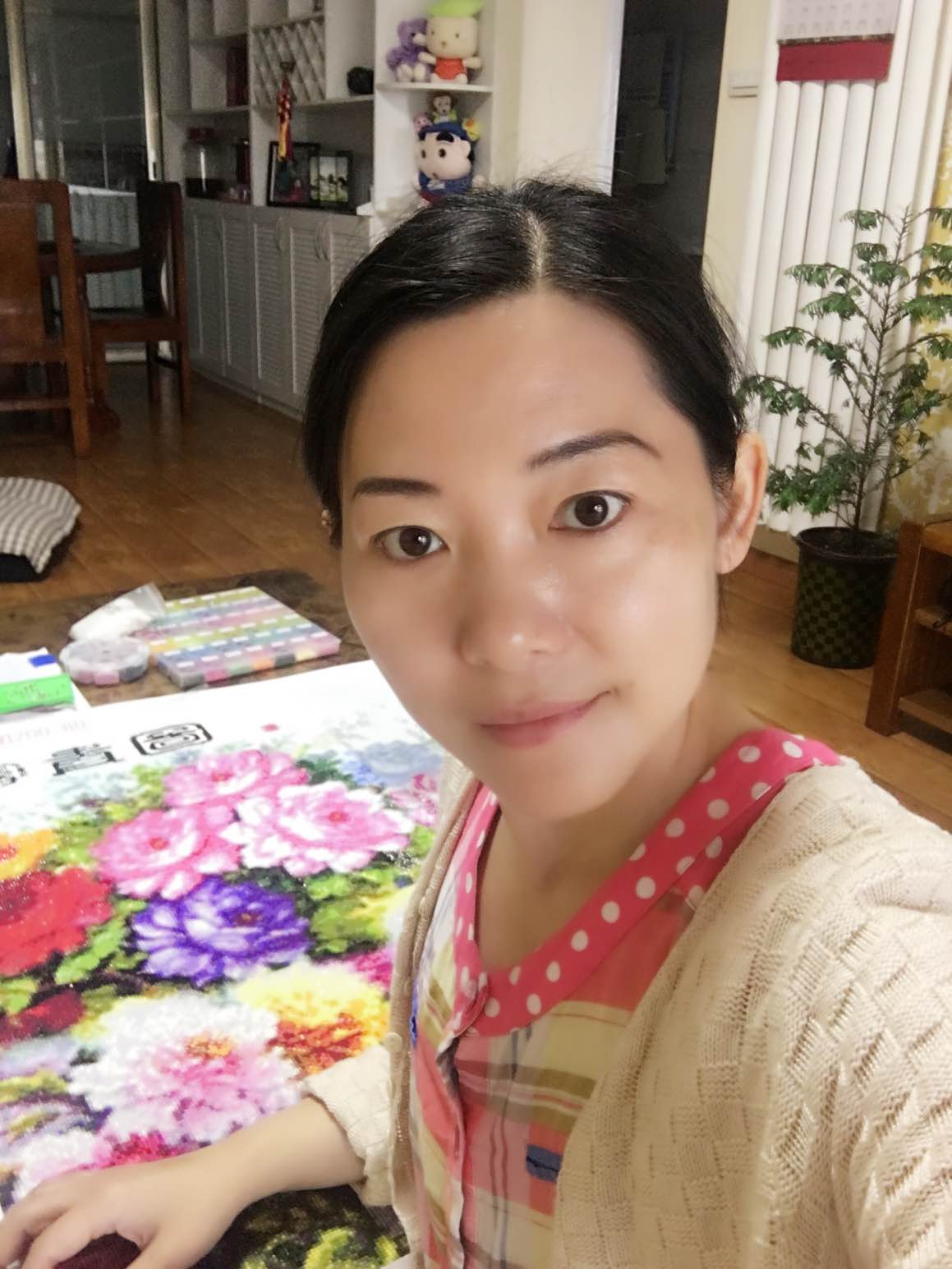 我从小喜欢做手工,自己裁剪过衣服,编织全家人的毛衣,自学钩花,家里各种编织书籍一大摞,还有各色毛线塞满了阳台的柜子,我总觉得自己织的毛衣暖和也合身。生病以后,有一年的时间没有拿过毛衣针,因为胳膊不能累更因为心里乱,无法静下来专心做事情。直到一年以后,心情慢慢平复,我才又拿起毛衣针,一口气给老公织了两件爱心貂绒衫。最近迷恋上了钻石画,真是个修心养性的好东西,泡一壶茶,净过双手,端坐在桌前,将一颗一颗闪亮的钻石粘到画布上,手机放个连续剧在一边听着声音,眼睛却专心在画布上,心里安静的感觉像修炼