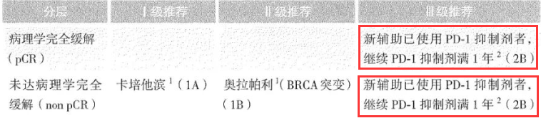 指南建议接受PD-1抑制剂新辅助治疗后病理学达到完全缓解的三阴性乳腺癌患者继续接受PD-1抑制剂辅助治疗满1年(2B级推荐);而对于接受PD-1抑制剂新辅助治疗后病理学未达到完全缓解的三阴性乳腺癌患者来说,在下一步的辅助治疗中仍需继续接受PD-1抑制剂治疗满1年(2B级推荐)[7]。