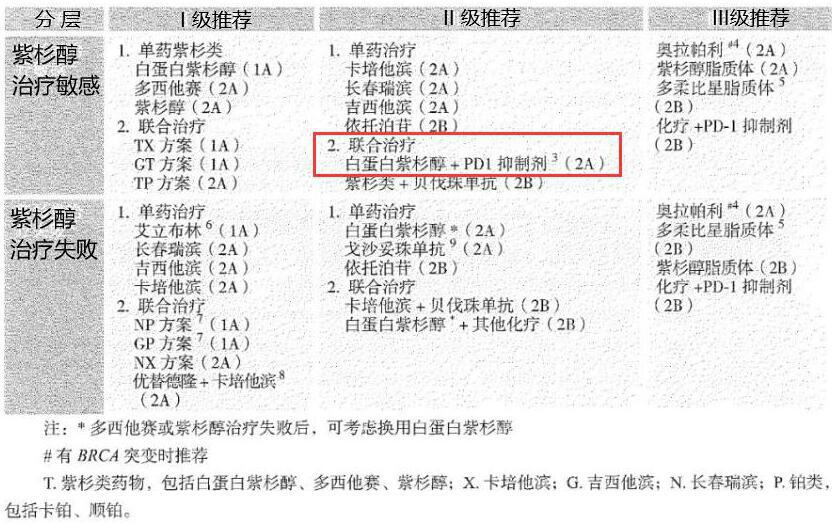 指南建议对紫杉醇治疗敏感的三阴性晚期乳腺癌患者使用白蛋白紫杉醇联合PD-1抑制剂(如帕博利珠单抗)治疗(2A级推荐)[7]。