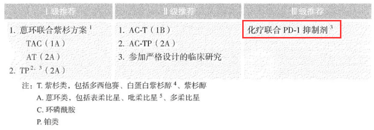 指南建议三阴性乳腺癌患者接受新辅助治疗时在紫杉类联合铂类化疗药物治疗的基础上增加PD-1抑制剂(如帕博利珠单抗)以提升患者病理学完全缓解的概率(III级推荐)[7]。