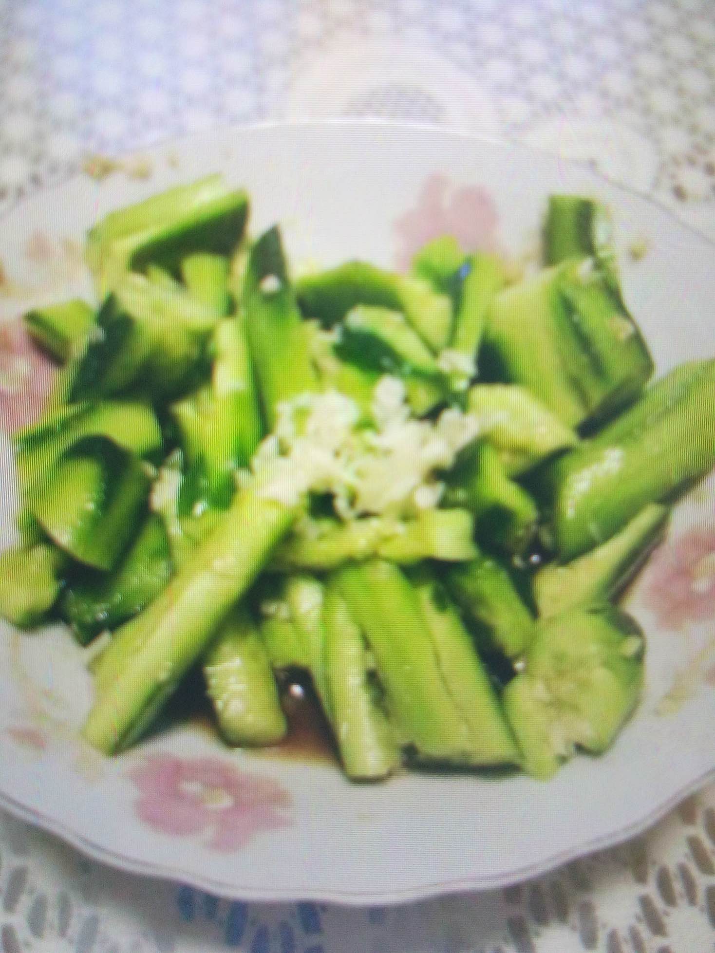 做法:黄瓜洗干净,对半刨开,用刀轻轻地拍一下,黄瓜切菱形,蒜头切沫,把蒜沫放入黄瓜中,放入麻油,鸡精拌匀。