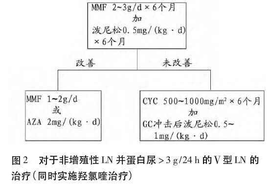 单纯Ⅴ型伴肾病综合征范围蛋白尿,基于较好的疗效/毒性比,初始治疗可应用糖皮质激素联合MPA(2B)或大剂量静脉CYC(2A),或环孢素(肾病综合征复发率增高)(2A),或他克莫司(3B),或利妥昔单抗(4C),剂量为:泼尼松0.5mg/(kg.d)口服,MPA(MMF靶剂量3g/d,6个月)联合口服作为初始治疗。CYC或钙调神经磷酸酶抑制剂(环孢素,他克莫司)或利妥昔单抗可作为治疗无反应时的替代治疗。
