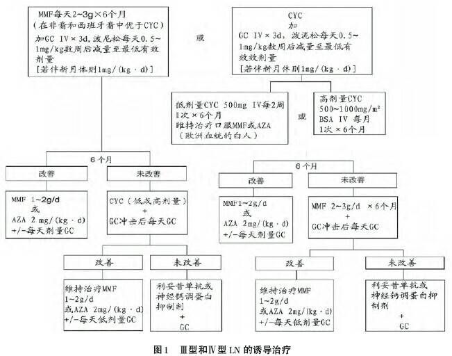 (MMF=霉酚酸酯;CYC=环磷酰胺(项目小组讨论针对想要保留生育能力的患者选择MMF优于CYC);GC=糖皮质激素;AZA=硫唑嘌呤)