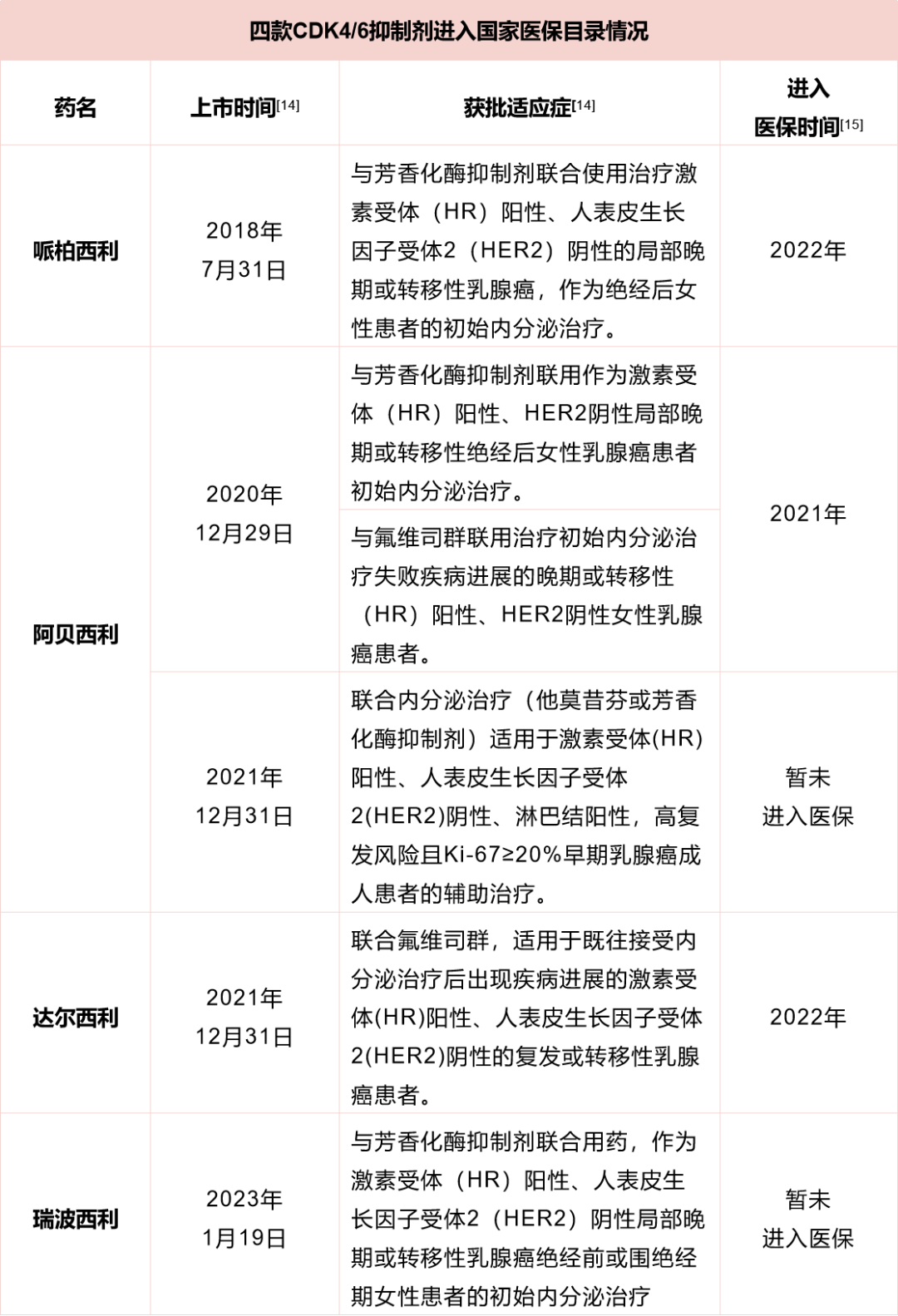 目前国内已获批的“西利四子”分别是哌柏西利、阿贝西利、达尔西利、瑞波西利,其中阿贝西利于2021年率先进入医保目录,哌柏西利和达尔西利2022年也成功进入医保。
