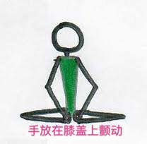然后将手掌放置双侧膝盖的上方,随着你的匀速呼吸慢慢轻柔地颤动双侧膝盖,可以保持这个动作三五分钟(看电视时以这个坐姿)。