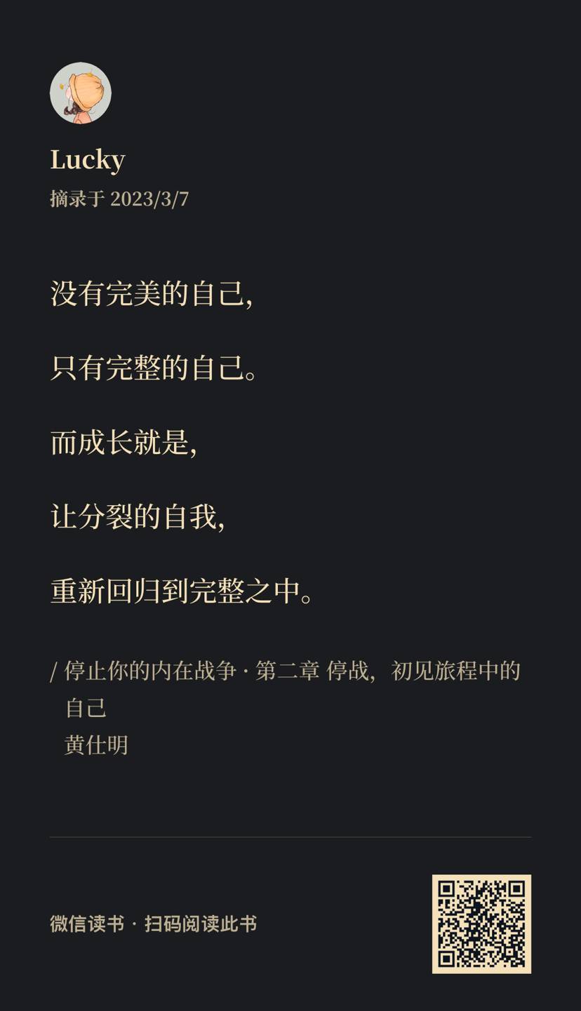 我不是完美的, 但我是完整的。 我拥有可爱减龄的圆脸 拥有爱我的家人 拥有每一个全新清晨 拥有开心的笑容 拥有和大家的遇见 我接纳我的小狼来客 我接纳我的不完美 接纳我的内心敏感 接纳我的内耗 接纳我的焦虑 接纳我的失眠 接纳我的激素脸,水牛背 接纳我要接纳的比我拥有的更多 无论好坏,它们都是我的一部分 我们都不需要完美 我们是完整的 内观自己,多和自己的内心连接 不要相信大脑对自我的评判 大脑是个程序,而我的心才是写代码的程序员 大脑是执行者,而我的心才是生命的创造者 每天给自己一些赞美式代码 我拥有甜美的笑容 我拥有爱笑的眼睛 我拥有白皙的肌肤 我拥有与狼共处的智慧 我拥有挑战自己的机会 我拥有早睡早起的特权 我拥有健康饮食适度运动的好习惯 我拥有被自己宠爱的每一天 我拥有更美好的自己 我拥有了拥有比接纳更多的可能性 我是不完美的, 我是完整的 我们都可以找到内心丰盈的自己 拥抱更加美丽的生命