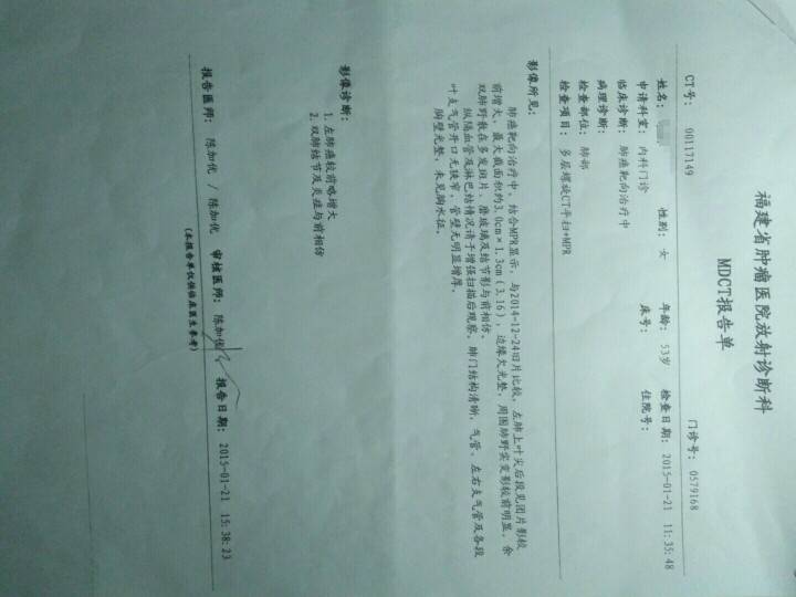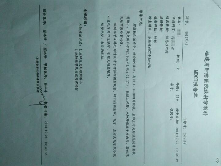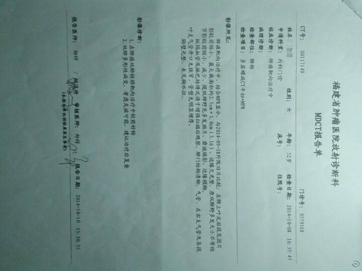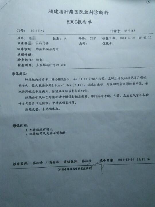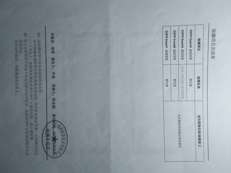 2014年9月27日到肿瘤医院后没有入院,医生叫我们先做基因检测,但我们在放疗期间,25日已经做了活检,只是报告未出,肿瘤医院医生说等报告出来再做决定,因为我们基因检测是送到上海去做的,所以报告到9月30日上午才拿到,这是得病后最完整最权威的诊断书-肺腺癌,19基因突变,医生说可以吃易瑞沙,就拿着处方到专卖店去买了,易瑞沙一个月3合15000元。吃过第一个月CT检查,报告说肿瘤缩小了,全家亲戚上下都为之高兴,第二个月满心欢喜就开始准备了拿赠药的所有资料,但三个月后报告肿瘤增大了,第四个月报告又增大了,医生说靶向药耐药了,不能再吃了,自己花了六万元,无效果,赠药也不可能拿到了,易瑞沙治疗到此就结束了。