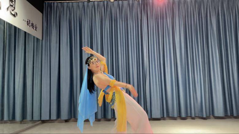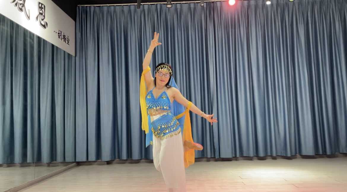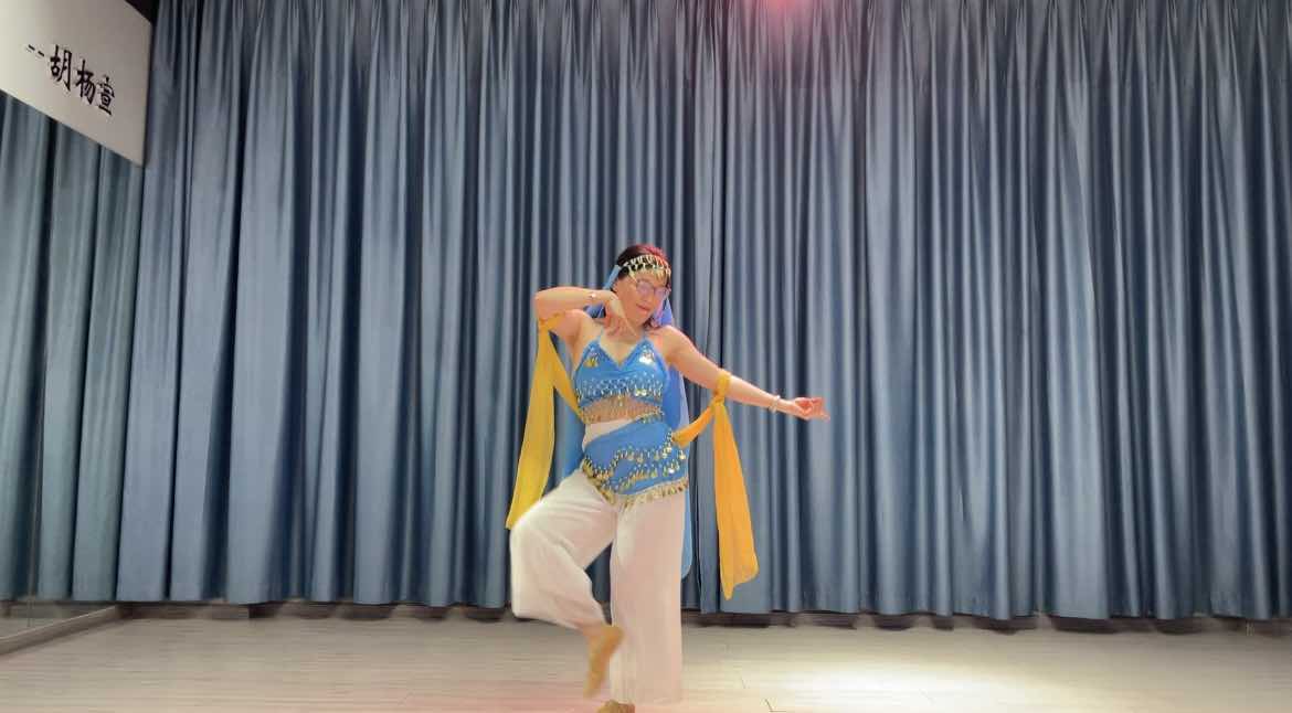 昨晚拍的舞蹈带点西域风情,我原本穿我自己的吊带,缺少点味儿。老师把她的西域风情舞蹈服拿出来借给大家穿,看着蓝色的文胸,还带有很多装饰,叮当作响,姐妹们说太暴露了都不敢穿。