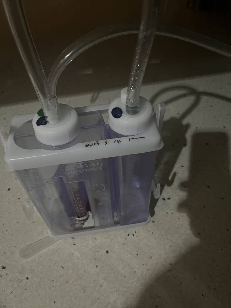肺结节微创手术和乳腺癌全切的疼痛绝对不是一个级别。看看这个引流瓶,这个引流管比乳腺的粗好几倍。