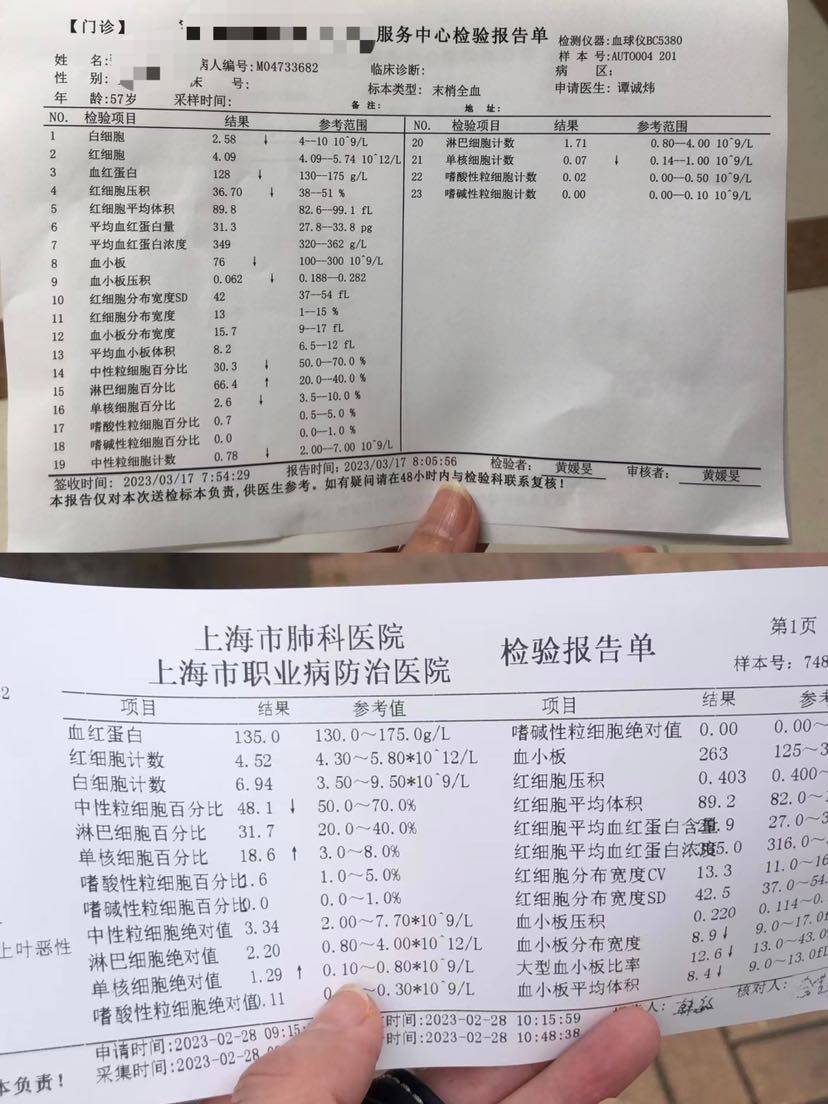 老公3/8化疗后,回家后按照医生要求吃地塞米松,阿瑞匹坦,基本正常!三天左右开始手上蜕皮,胃口变小了!今天3/13早上起来感觉不适,腿发软,浑身无力,中午发现他发烧了!38.5 于是给他吃了退烧药 ,胃口比较差!但愿尽快退烧吧!🙏 感觉是免疫疗法引起的发烧,才二次就这样严重了 3/17去验血白细胞血小板都下降迅速 !二次对比图