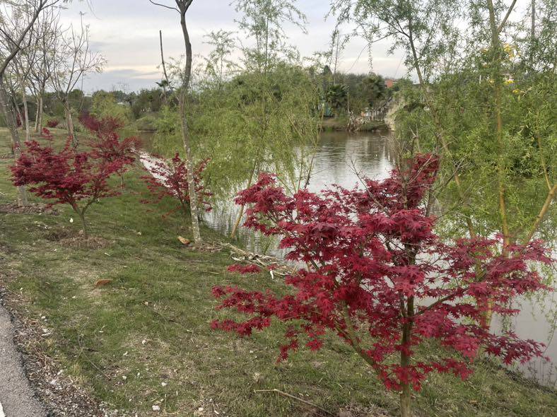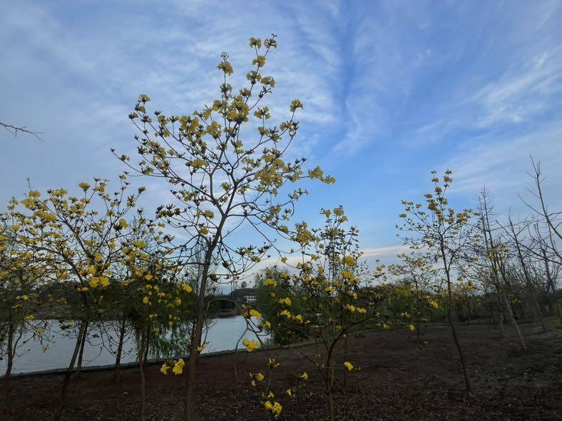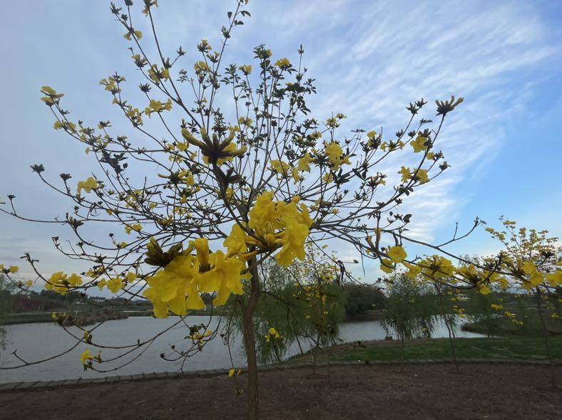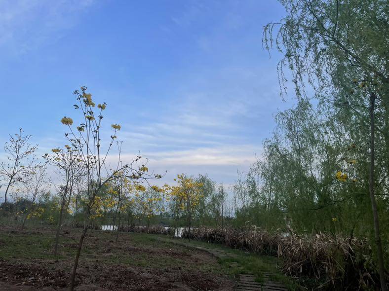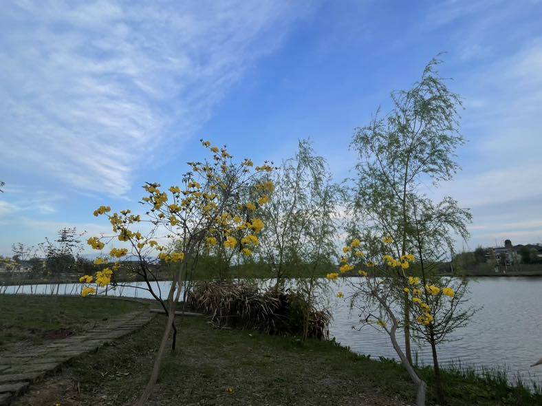 今天一早去郊外的康桥恬园散步,春风拂面,一派田园好风光。嫩绿的新叶,明亮的黄风铃,嫣红的观赏桃花,映着碧波荡漾的湖水。春天里走到哪里都让人心情舒畅。