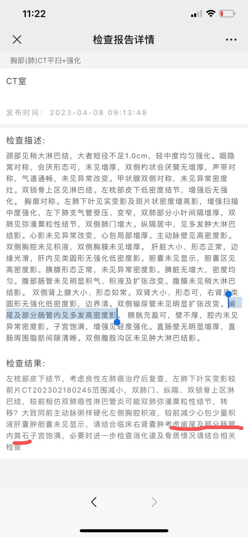 肠内的高密度影大概率是肠梗阻之类的,可以做个肠镜看看,一般肺癌转移极少转移到肠道