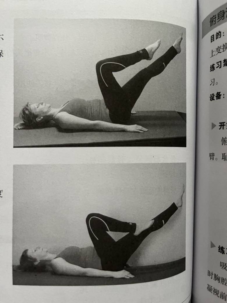 吸气,呼气收下巴,肩部离开地面,抬起上半身。再一次吸气,呼气右膝找胸口左腿蹬直与垫面呈45度度角。