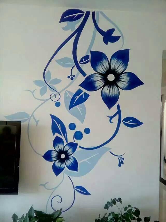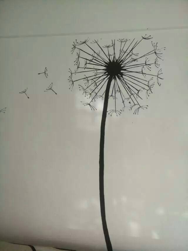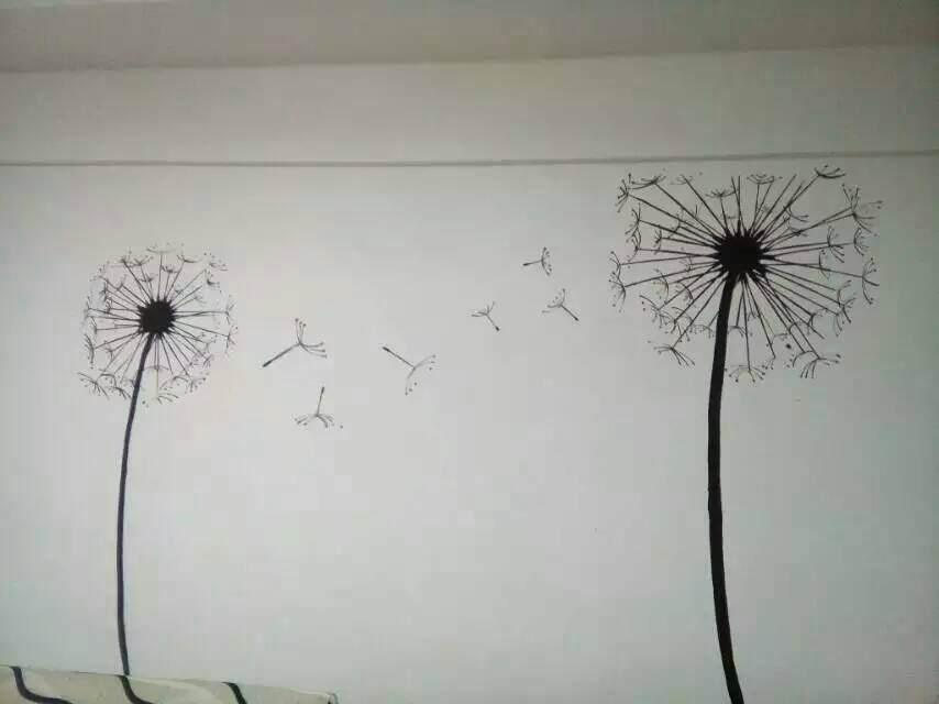 没有专业的图纸和画笔用了七天时间完成了,图是从网上搜的,原图是土黄色偏红,我把颜色改成宝蓝的,先用铅笔在墙上把图画好,在用纸胶带紧帖在线条的边缘这样上颜色时就不会涂到外面。对面的蒲公英没有打底稿直接画的。盯不住杆杆太密了就直接画上去的,用的是丙稀颜料,五年十年都不会掉的。费用一共花了六十元,很划算吧。下面是图,画的不是很好。将就看吧