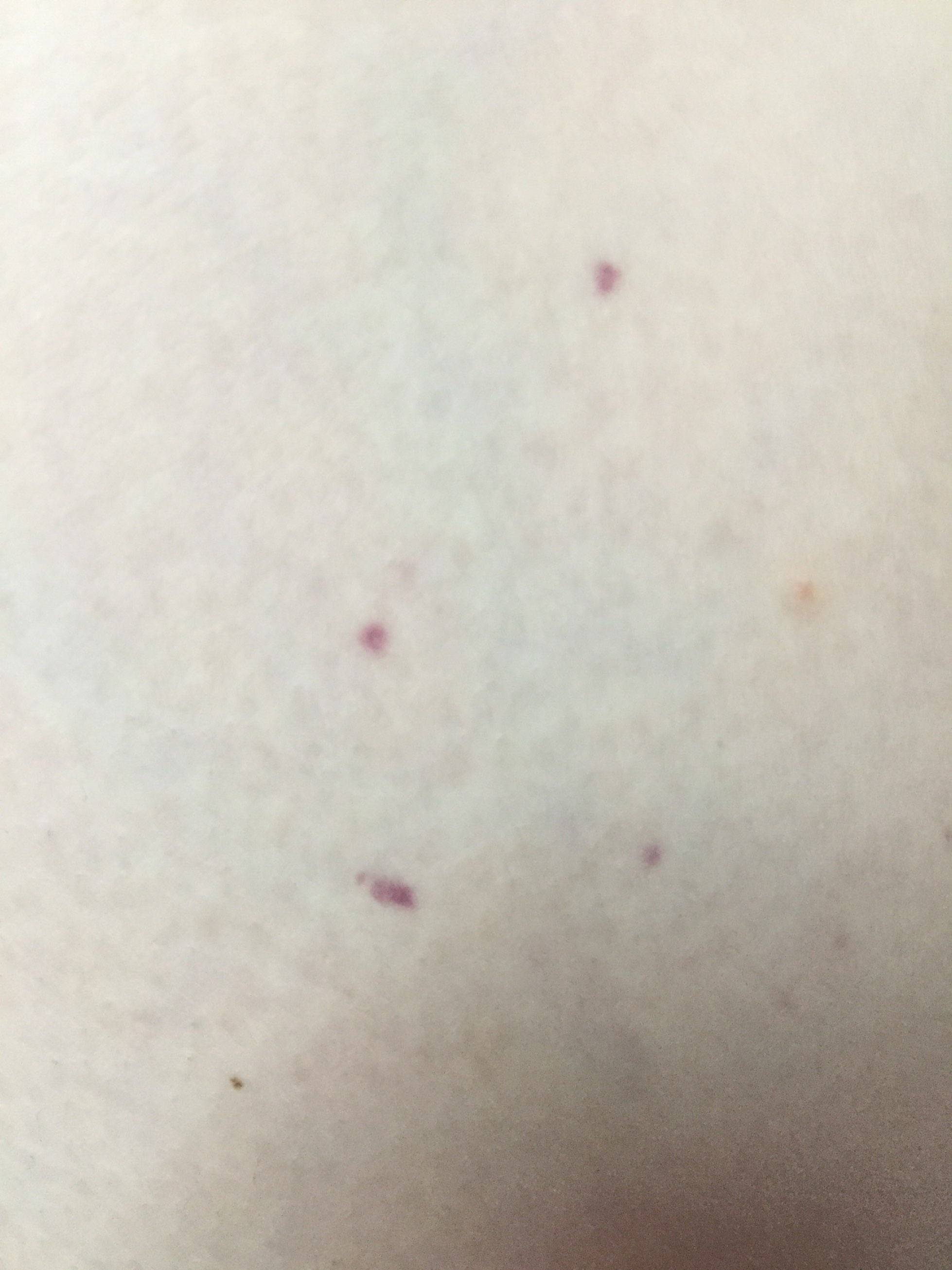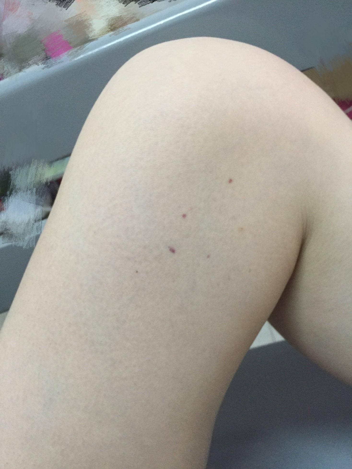 晒太阳了吧?我一粘阳光就和你一样,皮下出血。小心点,我不粘阳光,光感强