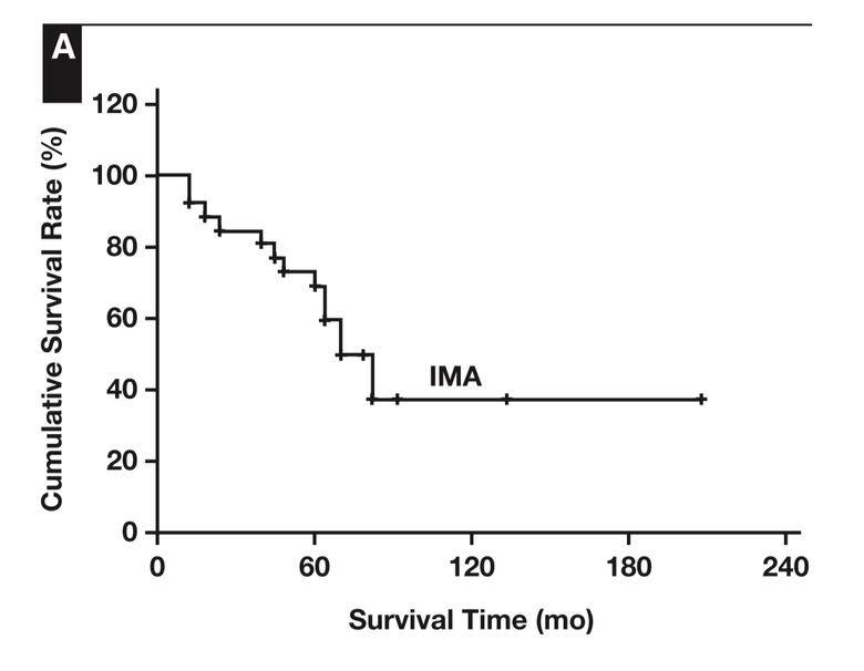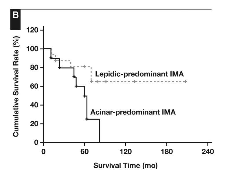 一项来自中山大学的研究(影响因子 5.4)统计了 1999 年至 2011 年间确诊为 IMA 的 26 位 I ~ III 期的患者,其中 16 位被诊断为为伏壁型为主的粘液腺癌,另外 10 位被诊断为腺泡型为主的粘液腺癌。 这些患者在经过手术治疗后的五年总生存率是 69.2%。