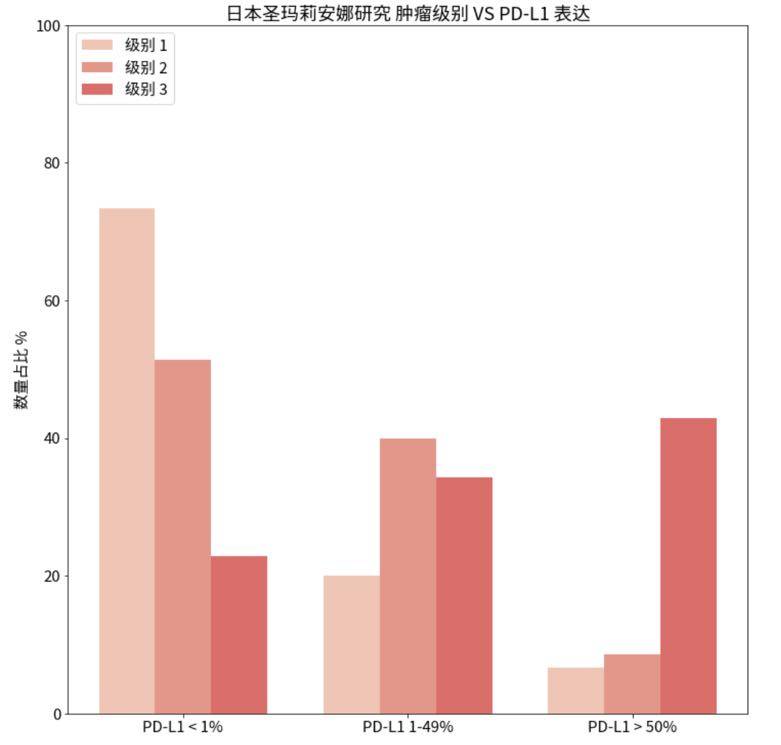 数据繁复,只摘录一张我自己通过日本圣玛丽安娜医院的数据做的统计图。从上图看,其实能比较明显的看出这个趋势:级别越高的肺肿瘤,越有可能呈现 PD-L1 阳性,甚至强阳性。
