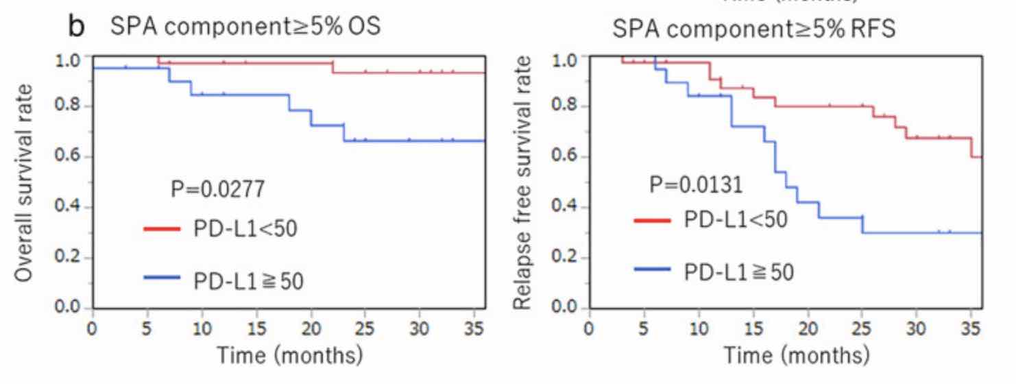 圣玛丽安娜医院的研究者深入研究后发现,当肺部肿瘤包涵至少 5% 以上的实性增长成分时,有更高的概率检出 PD-L1 强阳性。而在这些含 5% 以上实性增长的肺部肿瘤患者中,PD-L1 强阳性(蓝线)的患者,其术后的总生存期 (OS,左图)和无复发生存期 (RFS,右图)是要弱于 PD-L1 非强阳性组的(红线)。