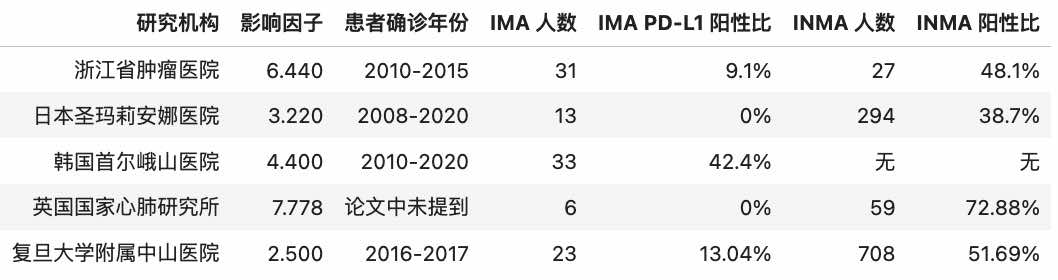 可以看到,其实除了韩国首尔峨山医院论文的数据中, IMA 患者 PD-L1 的表达相对比较高以外,其余论文数据基本都统一支持了 IMA 患者 PD-L1 表达较低。