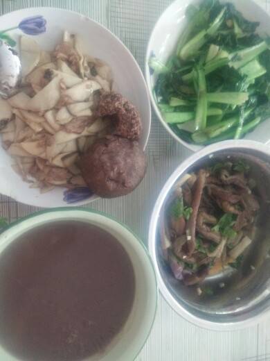 青菜,鸡腿菇炒肉,凉茄子。杂娘粥