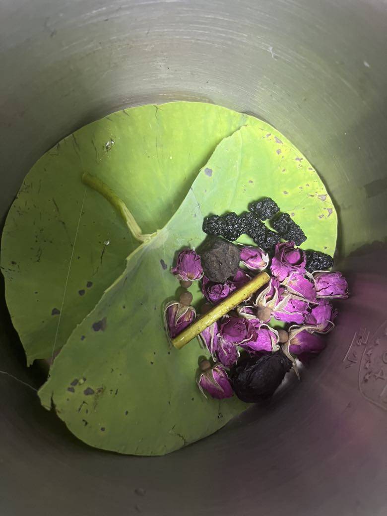 小荷叶一片,平阴玫瑰几颗,桑葚干几颗,乌梅两颗。