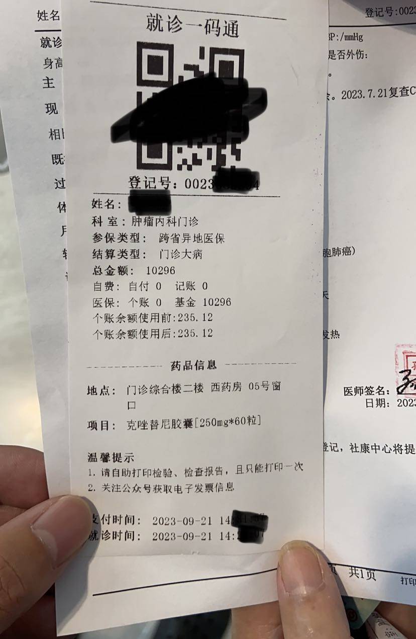 今天带妈去医院开靶向药克唑替尼,提前在网上绑定了异地就医的医院,因为是第一次异地开药,还有点忐忑不知道能不能顺利走医保报销,结果居然全额报销了,个人医保账户一分钱都没扣。以前在老家开药都是统筹报销大部份,自己还得出一两千左右,今天实在意外。