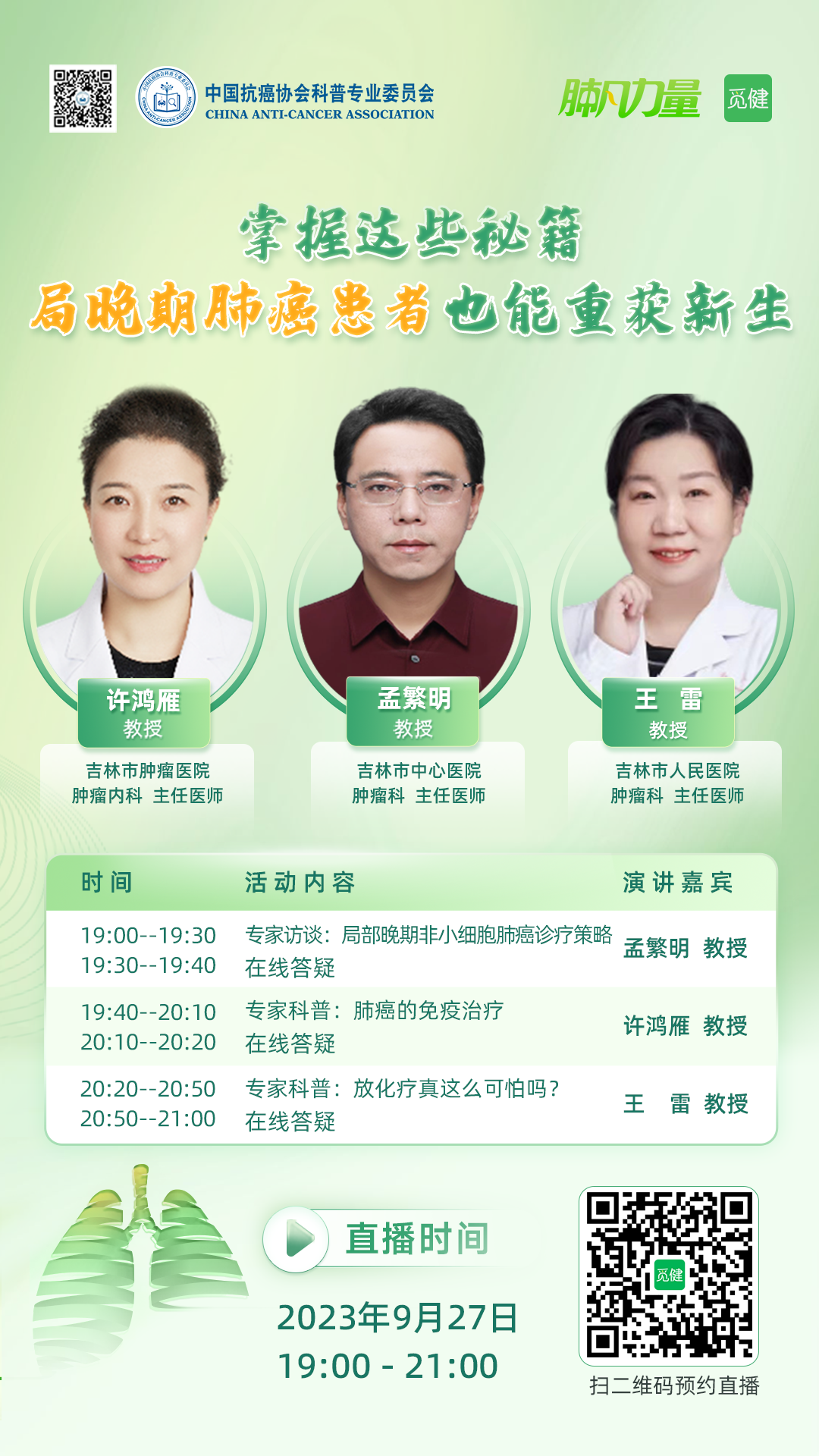 在本次直播中,孟繁明教授将为觅友们详细讲解局部晚期非小细胞肺癌的诊疗策略;许鸿雁教授将为大家科普肺癌的免疫治疗如何进行;王雷教授将为大家解谜放化疗真这么可怕吗?